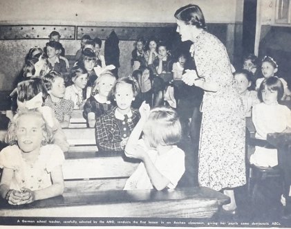 Une institutrice allemande, soigneusement sélectionnée par l’AMG, donne le premier cours dans une salle de classe à Aix-la-Chapelle, enseignant à ses élèves un ABC démocratique.