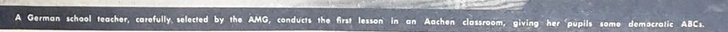 « A german school teacher, carefully, selectioned by the AMG, conducts the firts lesson in an Aachen classroom, giving her pupils some democratic ABC. »