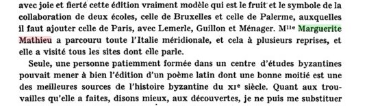 « Mlle Marguerite Mathieu a parcouru toute l’Italie méridionale, et cela à plusieurs reprises, et elle a visité tous les sites dont elle parle« , notait le fameux byzantiniste Henri Grégoire en 1962 (voir la coupure de presse qui suit).