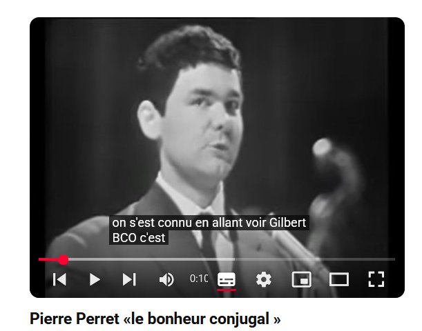 « Pierre Perret « le bonheur conjugal ». Dans un programme intitulé « La nouvelle vague de la chanson française ». Festival de musique de Nice, diffusé le 13 août 1961, réalisation Yves André Hubert/RTF. » On y retrouve déjà tout son fonds de commerce dans le genre populo rigolo, canaille mêlé d’argot (il a été formé par la clientèle populaire du bistrot tenu par ses parents, le Café du Pont à Castelsarrasin). Ne manque ici que le vraiment grivois voire libertin.