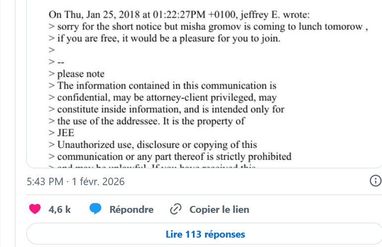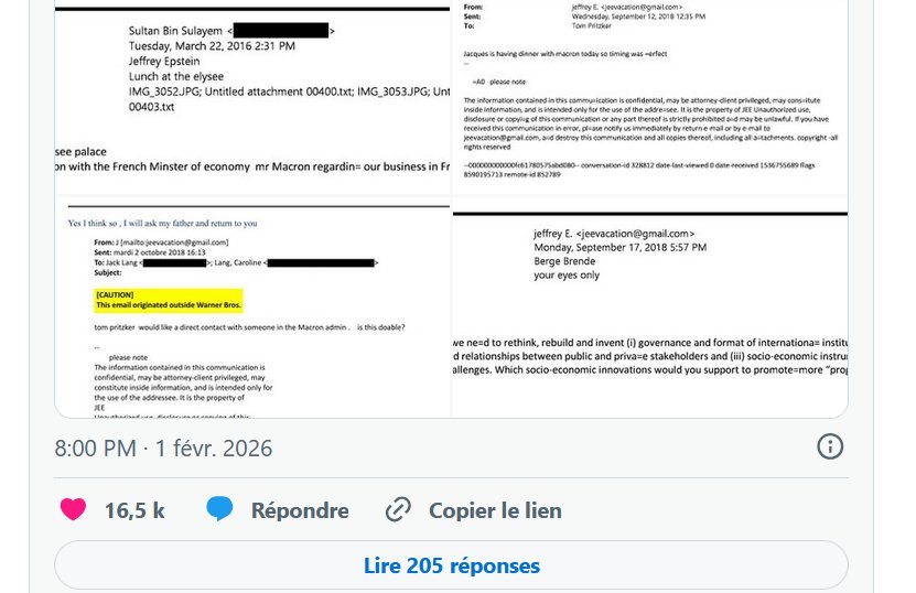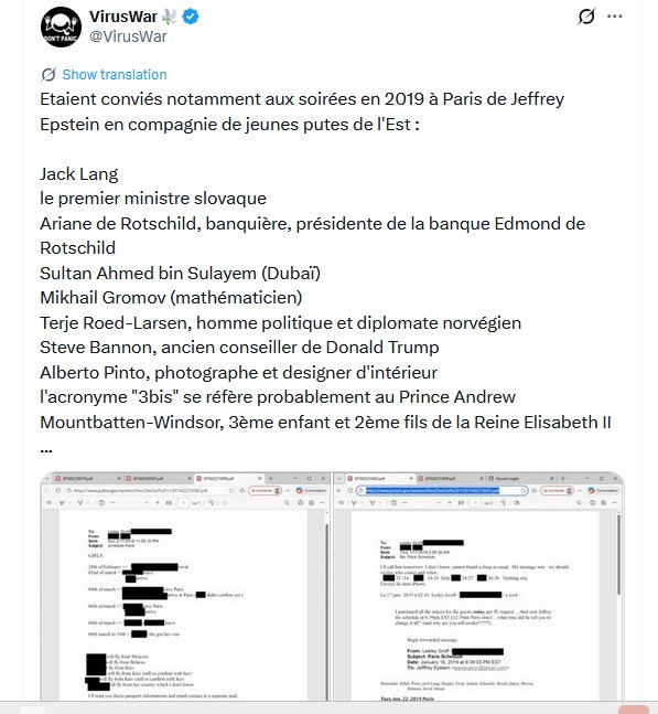 En se focalisant sur Trump, Musk et Gates, la presse mainstream ignore le volet français de l’affaire Epstein. « Y-a-t-il un complot de la presse française pour étouffer le volet français ? » s’interroge @viruswar. Et, même si Médiapart a évoqué les liens financiers entre Epstein et la famille Lang, pourquoi se focaliser uniquement sur les financiers en omettant les autres aspects du dossier ?