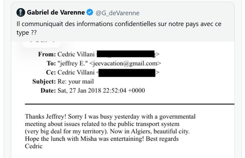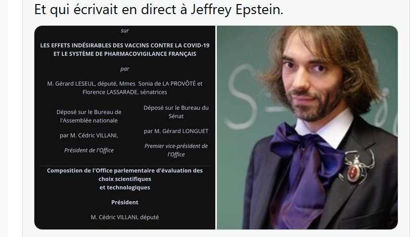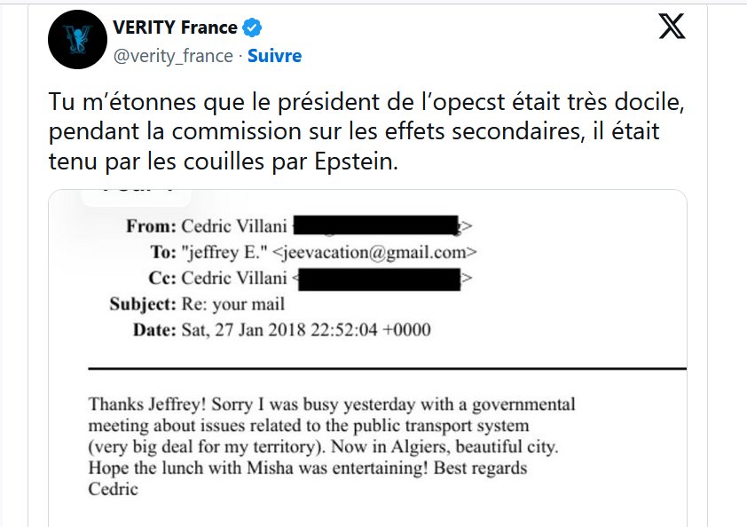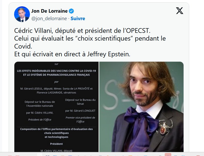 D’autres noms sont présents dans les documents : Pierre Moscovici (ex-commissaire européen et Président de la Cour des comptes du 3 juin 2020 au 31 décembre 2025), Bruno Le Maire (ex-ministre de l’Économie et des Finances) ou Cédric Villani (mathématicien). Ce dernier, ex-président de l’OPECST, fait l’objet d’interrogations sur sa proximité avec Epstein et le rôle qu’il a pu jouer comme président de l’organe qui a enquêté sur les effets secondaires de la vaccination covid, ne rendant pas publics certains témoignages (Vincent Pavan, Emmanuelle Darles et Christine Cotton).