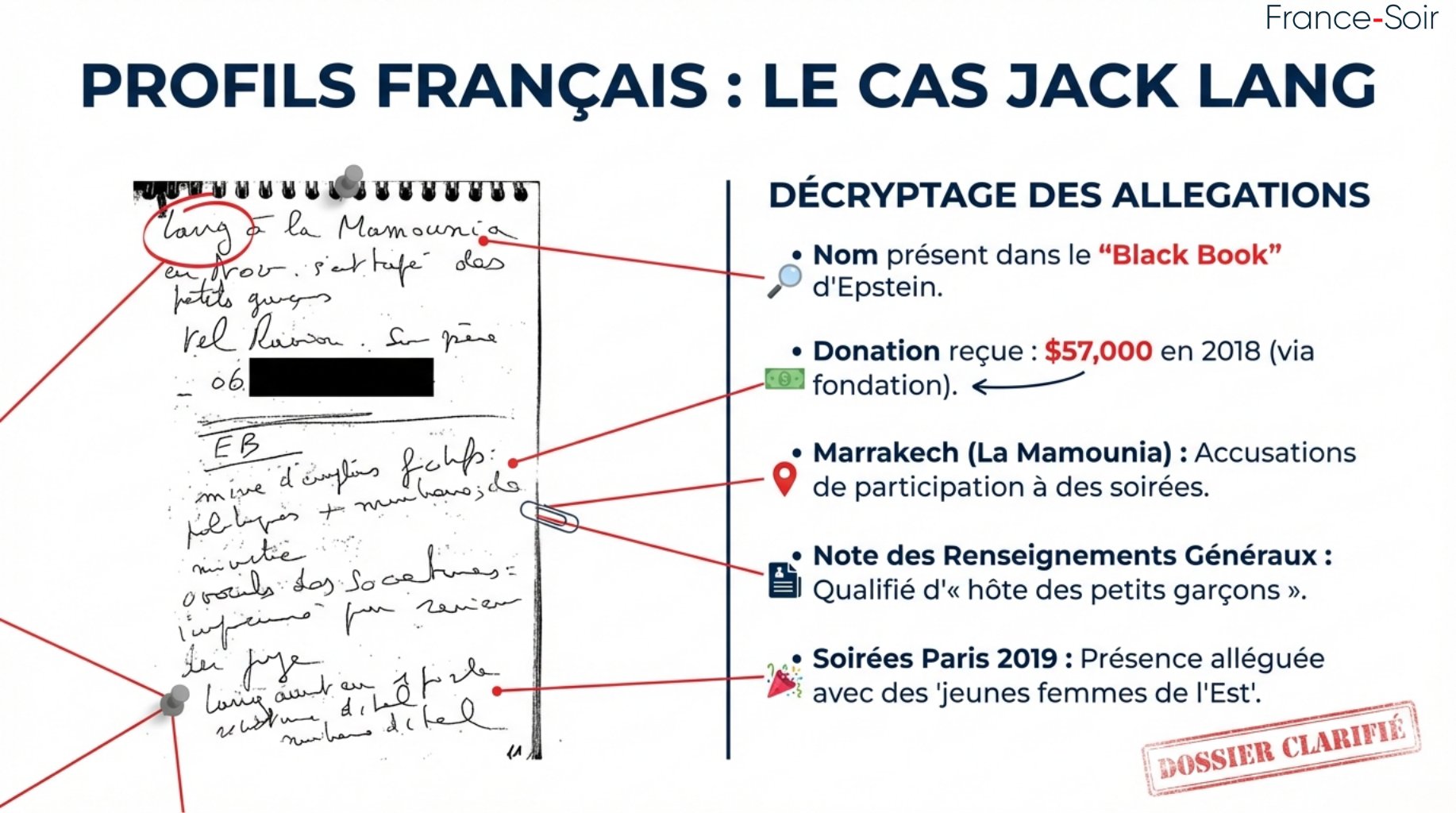 Le nom de Jack Lang, ancien ministre de la Culture, apparaît dans le « black book » d’Epstein ayant reçu une donation de plus de 57 000 dollars en 2018 via une fondation liée à lui, prétendument pour financer un film. Des rumeurs persistantes, amplifiées par les carnets d’Yves Bertrand (ex-directeur des Renseignements généraux), l’accusent de participation à des soirées impliquant des mineurs, notamment à l’hôtel La Mamounia à Marrakech. Voici la page en question. (1)