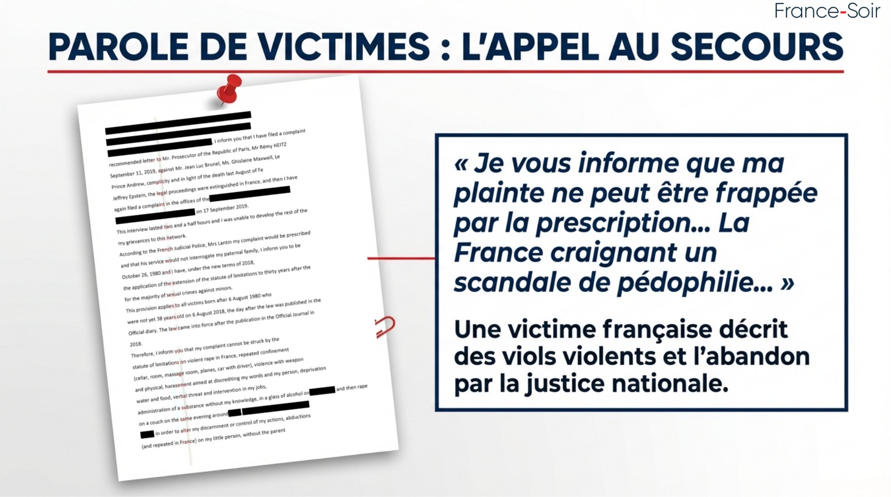 Pour montrer l’étendue du problème, une victime française figurant dans les dossiers Epstein a envoyé un email à un juge américain demandant la réouverture de son affaire, la France craignant un scandale de pédophilie. Elle y décrit en détail les viols et les violences et dit avoir écrit sans succès au procureur de la République Remy Heitz en septembre 2019.