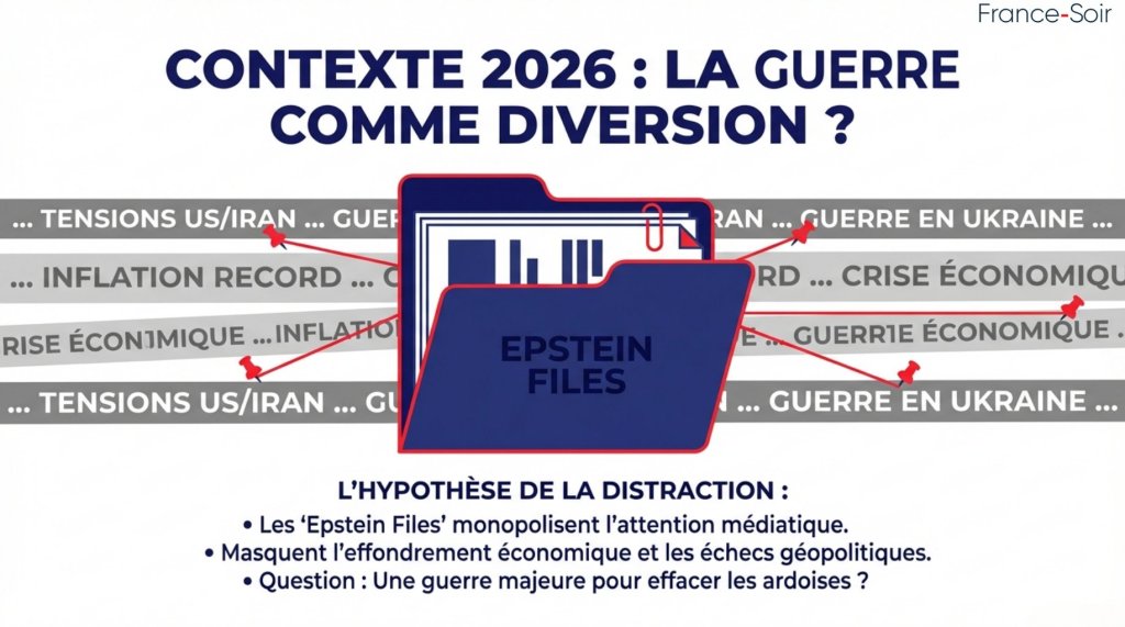 Les « Epstein files » monopolisent l’attention, détournant le regard d’une économie catastrophique (inflation galopante, dettes records) et des impossibilités de paix. Dès lors, une guerre militaire d’ampleur dans laquelle l’Occident serait partie prenante permettrait aux dirigeants occidentaux, tous responsables de cette catastrophe économique, d’échapper à leurs responsabilités en détournant l’attention des peuples. C’est ainsi que des forces atlantistes qui publiquement déclarent vouloir la paix, pourraient bien, en coulisses, saboter les efforts qui sont faits en ce sens ; à savoir pour maintenir l’hégémonie US ou pour profiter de contrats d’armement. Des lobbies militaro-industriels influençant les décisions, ou des services secrets orchestrant des fuites pour déstabiliser des rivaux géopolitiques, il ne s’agirait pas là d’une première. L’histoire en compte à foison.