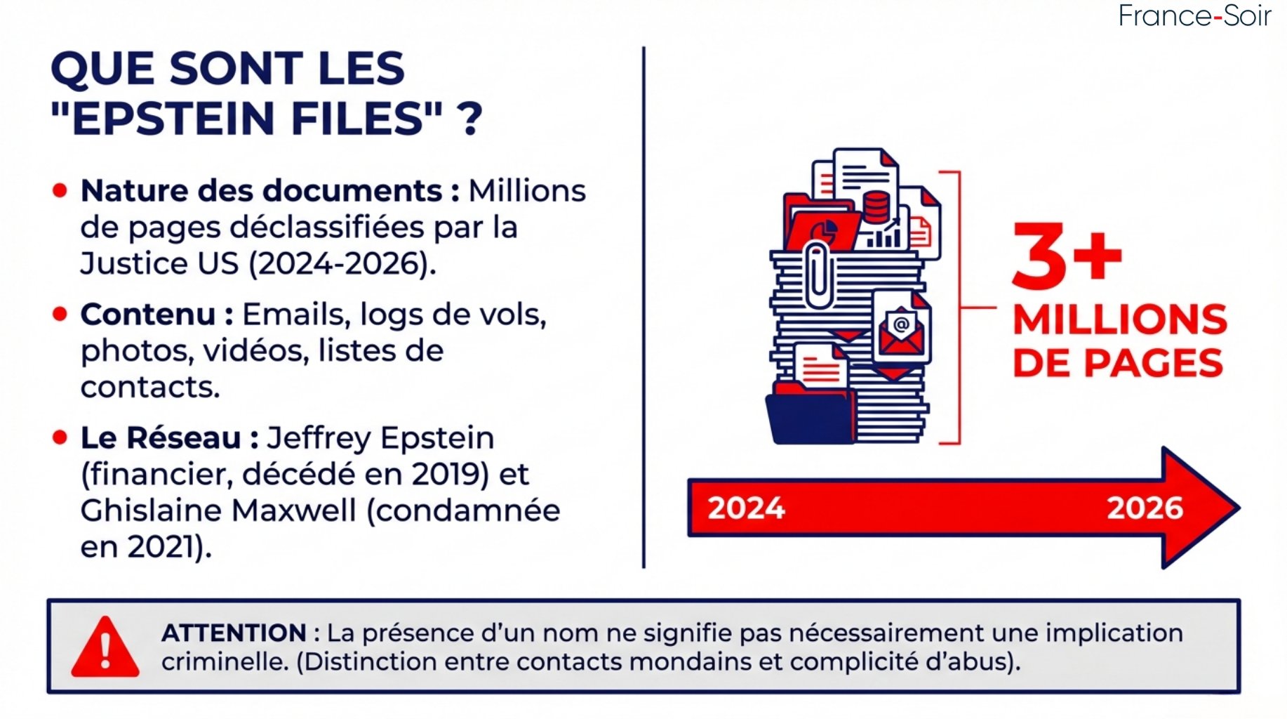 Les « Epstein Files » consistent en ceci : des millions de pages de documents déclassifiés par le Département de la Justice américain entre 2024 et 2026. Ces documents ont jeté une lumière crue sur le réseau tentaculaire du financier Jeffrey Epstein, un milliardaire américain ami des puissants condamné pour trafic sexuel, et décédé en prison en 2019 dans des circonstances controversées. Constitués essentiellement d’emails, de photos, de vidéos et de listes de contacts, ces documents révèlent des allégations graves d’abus sexuels sur mineurs, de prostitution et de chantage impliquant des personnalités influentes.