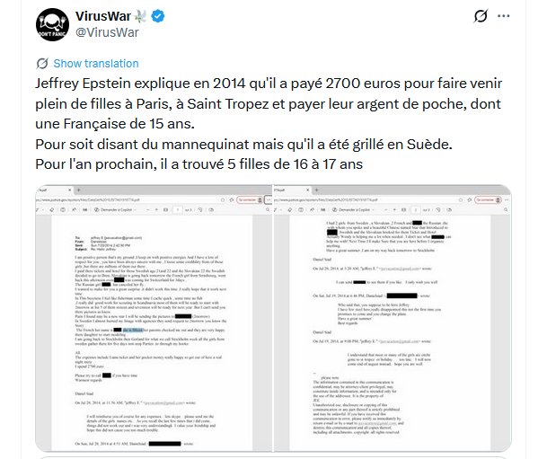 Des tweets comme celui de @VirusWar citent un document de 2014 où Epstein, via un recruteur nommé Daniel Siad, parle de payer 2 700 euros pour faire venir des filles de 15-17 ans (dont une Française de 15 ans) à Paris et à Saint-Tropez, sous prétexte de mannequinat, mais avec des intentions claires d’exploitation. Le tweet complet : « Jeffrey Epstein explique en 2014 qu’il a payé 2700 euros pour faire venir plein de filles à Paris, à Saint Tropez et payer leur argent de poche, dont une Française de 15 ans. Pour soi-disant du mannequinat mais qu’il a été grillé en Suède. Pour l’an prochain, il a trouvé 5 filles de 16 à 17 ans » – avec une source PDF confirmant l’email de Siad détaillant les paiements pour des filles suédoises, slovaques, françaises et russes, âgées de 15 à 22 ans, pour des « surprises » et des « parties non-stop ». Ces actes répréhensibles – viols, chantage via des enregistrements – montrent un système d’impunité protégé par le pouvoir et l’argent.