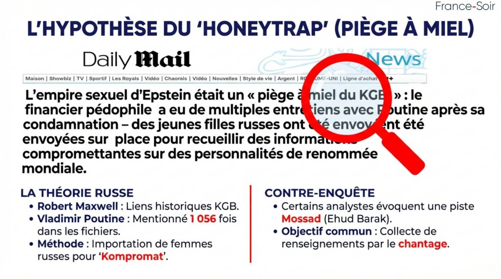 Selon un article du Daily Mail basé sur des sources d’intelligence et plus de trois millions de documents déclassifiés, l’empire sexuel d’Epstein aurait servi de « piège à miel » (honeytrap) pour le KGB, visant à collecter du éléments compromettants (kompromat) sur des figures puissantes. Les files mentionnent Vladimir Poutine 1 056 fois et Moscou 9 629 fois, bien qu’aucune preuve documentaire ne lie directement Poutine ou ses espions aux activités d’Epstein. Des sources affirment que des filles russes étaient importées pour compromettre des invités, avec l’île d’Epstein équipée de technologies de surveillance. Epstein aurait eu des liens avec l’intelligence russe via Robert Maxwell (père de Ghislaine, décrit comme un atout russe dès les années 1970), impliqué dans le blanchiment d’argent et des deals avec Epstein.