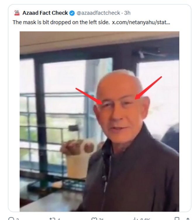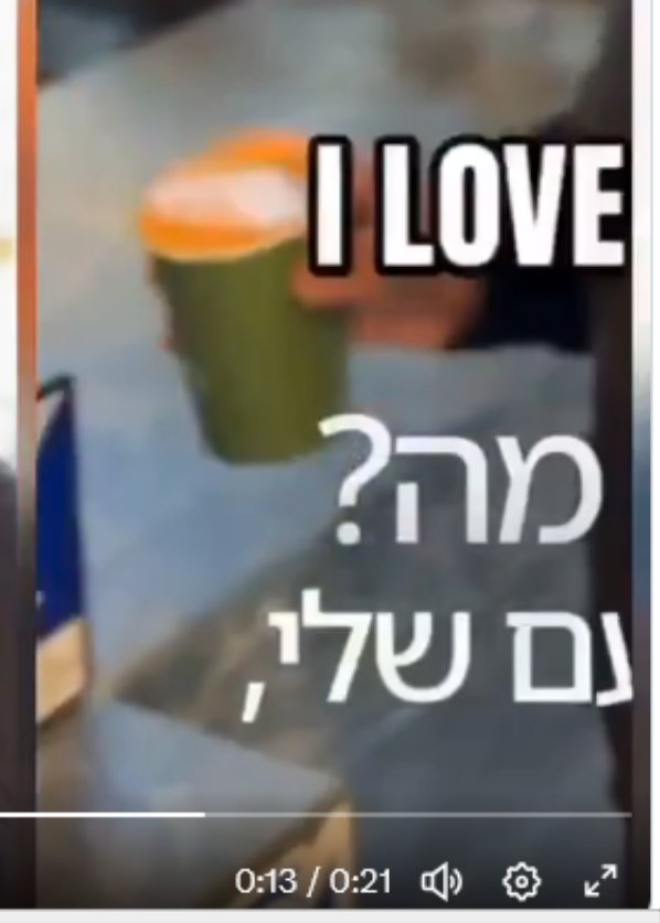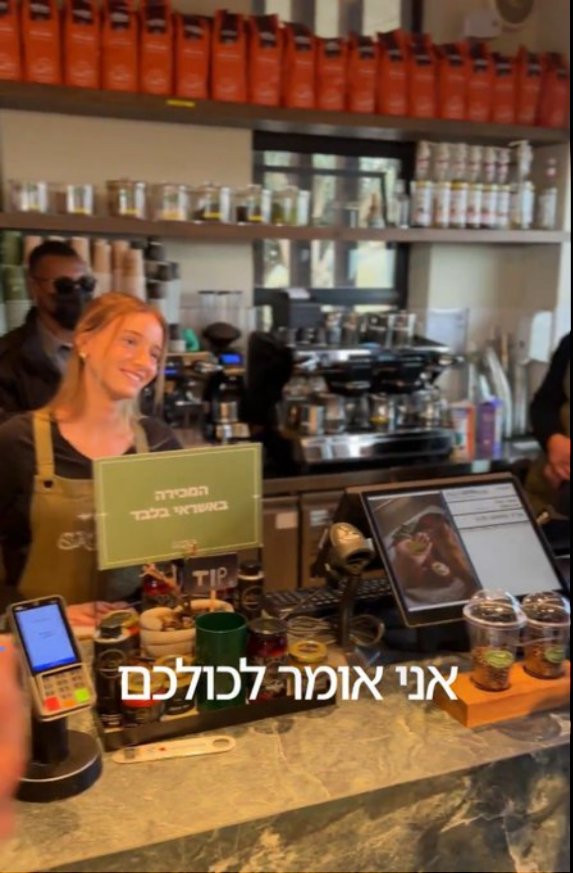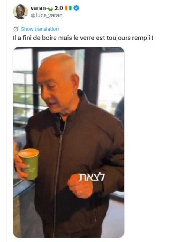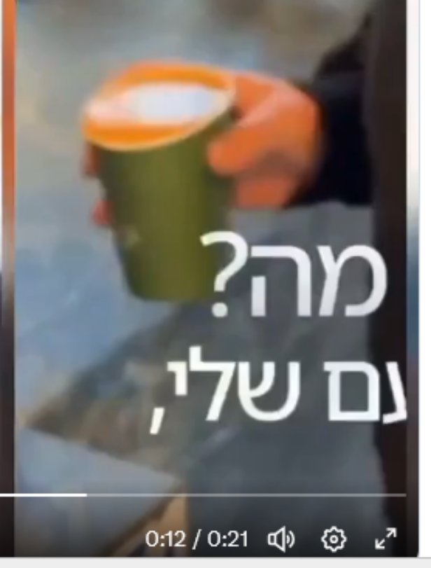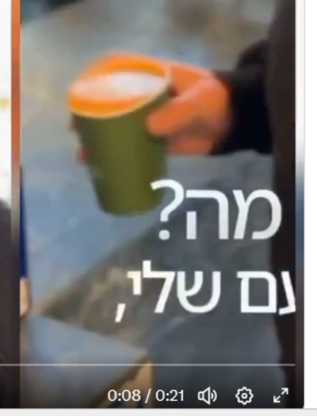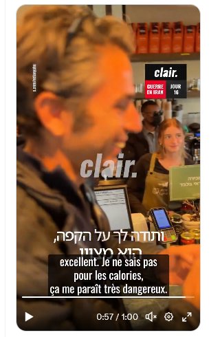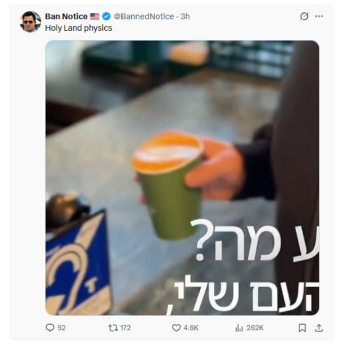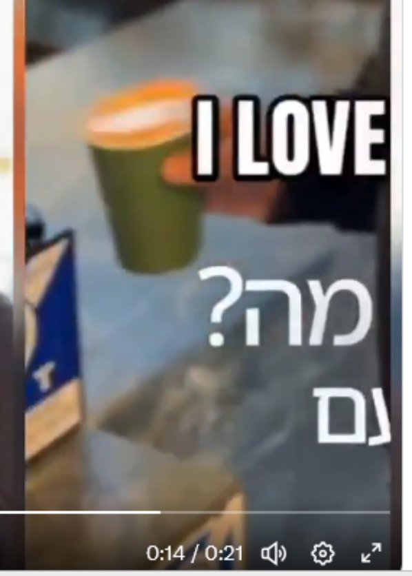 « J’ai de sérieuses questions concernant la validité de cette manifestement évidente vidéo d’IA. Poche magique. Café dans la tasse défiant la gravité. Client masqué derrière le comptoir. Bien essayé… NOTenyahu »