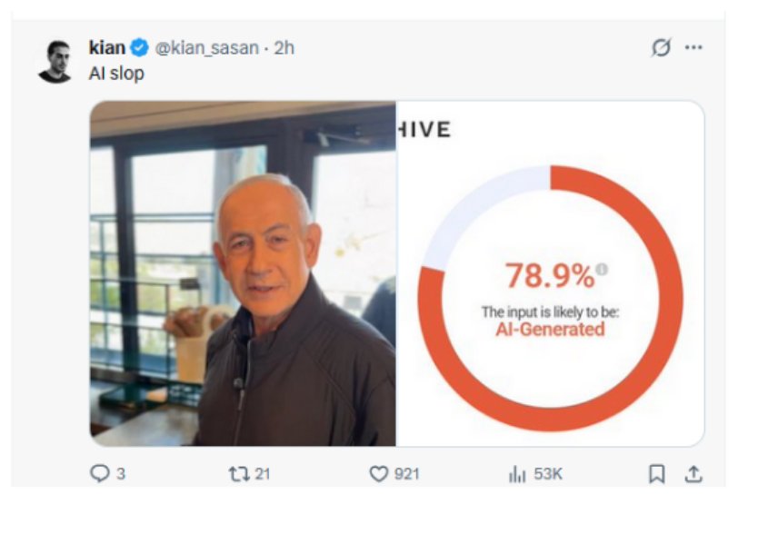 Comme l’écrit un anonyme : « Je ne crois pas que le Mossad ni quiconque sur cette terre soit capable de générer une vidéo IA sans aucun artefact visuel si celle-ci dépasse quelques dizaines de frames [images, trames, cadres, structures]. Il n’existe aucune technologie connue aujourd’hui qui permette de faire ça […] Et plus la vidéo est longue (en termes de secondes, pas de minutes), plus la probabilité d’apparition de ces artefacts augmente exponentiellement. […] Attention : je ne dis pas qu’il est mort. Je dis juste qu’on ne peut pas produire une preuve de vie valable via une IA générative qui passerait sous le crible d’une analyse détaillée ».