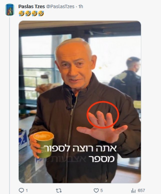 Il y a peu de jours était apparu sur le compte officiel du Premier ministre israélien Benyamin Mileikowsky dit Netanyahu, une vidéo visiblement faite par la dénommée IA, où il apparaissait furtivement avec des mains à six doigts. Puis le compte officiel a récidivé, tandis que le compte de son fils qui passait son temps jusque là à « touiter » sur tout et rien est devenu muet.