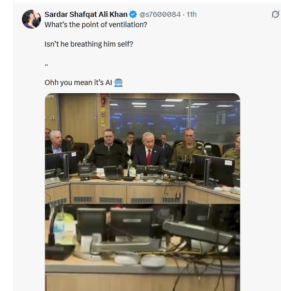 Donc Bibi est juste présentable « pour de rire » ou « pour du beurre » (kasher) mais pas « pour de vrai ». Dans le monde réel, est-il défiguré ? blessé, encore à l’hôpital ? planqué dans un super-bunker ? A-t-il été exfiltré, depuis plusieurs jours, de la Palestine occupée vers quelque île epsteinienne ? ou a-t-il défunté ; et est-il déjà six pieds sous terre ?