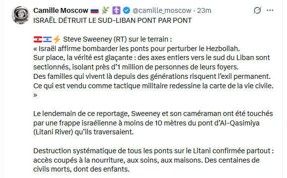 Sur place, la vérité est glaçante : des axes entiers vers le sud du Liban sont sectionnés, isolant près d’1 million de… pic.twitter.com/mi5W7Qy2G0