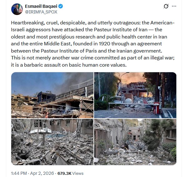 « C’est déchirant, cruel, ignoble et absolument scandaleux : les agresseurs américano-israéliens ont attaqué l’Institut Pasteur d’Iran, le plus ancien et le plus prestigieux centre de recherche et de santé publique d’Iran et de tout le Moyen-Orient, fondé en 1920 grâce à un accord entre l’Institut Pasteur de Paris et le gouvernement iranien. Il ne s’agit pas simplement d’un crime de guerre de plus commis dans le cadre d’une guerre illégale ; c’est une atteinte barbare aux valeurs humaines fondamentales. »