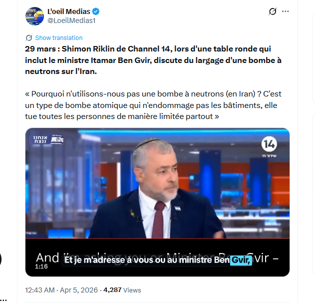 Admirons le rire gras de cet infecte personnage et de toute l’assistance d’ailleurs ; et de l’autre taré à kippa ben gvir qui entend éliminer le terrorisme (sic) en détruisant l’Iran !