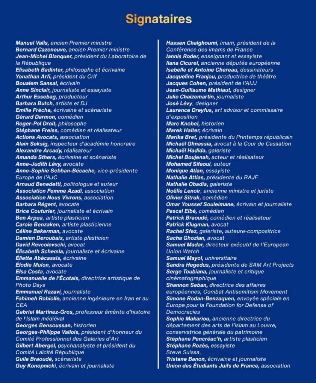 Notons, dans le tas, la présence récurrente (mais qui ne récure pas grand-chose au fond de ce bourbier) des Badinter, Sinclair, Arthur, Darmon, Bensoussan, Halter, Boujenah. Mais, par contre, l’absence de DSK, Finkie, Macias et BHL.