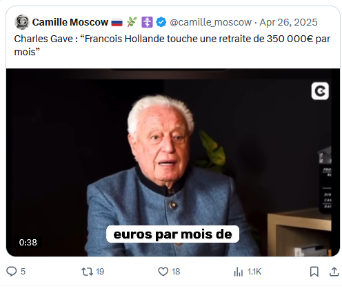 Charles Gave : “Francois Hollande touche une retraite de 350 000€ par mois” pic.twitter.com/jFse983fpz— Camille Moscow 🇷🇺 🌿 ☦️ (@camille_moscow) April 26, 2025