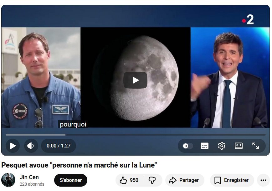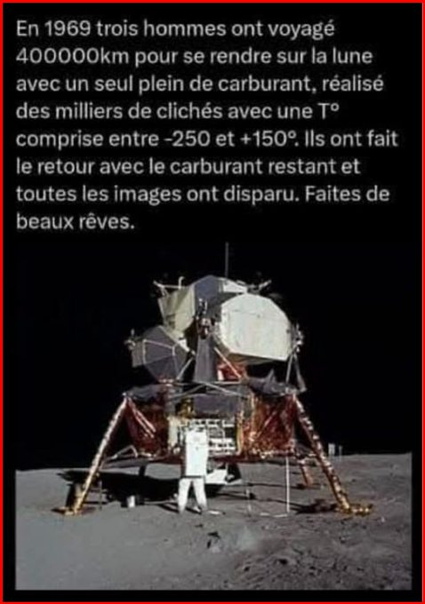 Je ne sais plus quel jour de juillet 1969, première marche sur la Lune (sic), en direct et en noir et blanc, à la téloche vers cinq heures du mat’, heure française. Donc programmée en soirée pour l’Amerloquie, à l’heure, au taux publicitaire de pleine écoute. Je l’ai vue et ma réflexion d’alors n’était pas encore de me dire que tout cela n’était que du pipeau, de l’esbroufe de Guerre froide.
