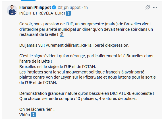 Ce soir, sous pression de l’UE, un bourgmestre (maire) de Bruxelles vient d’interdire par arrêté municipal un dîner qu’on devait tenir ce soir dans un restaurant de la ville ! 🤦🏻♂️